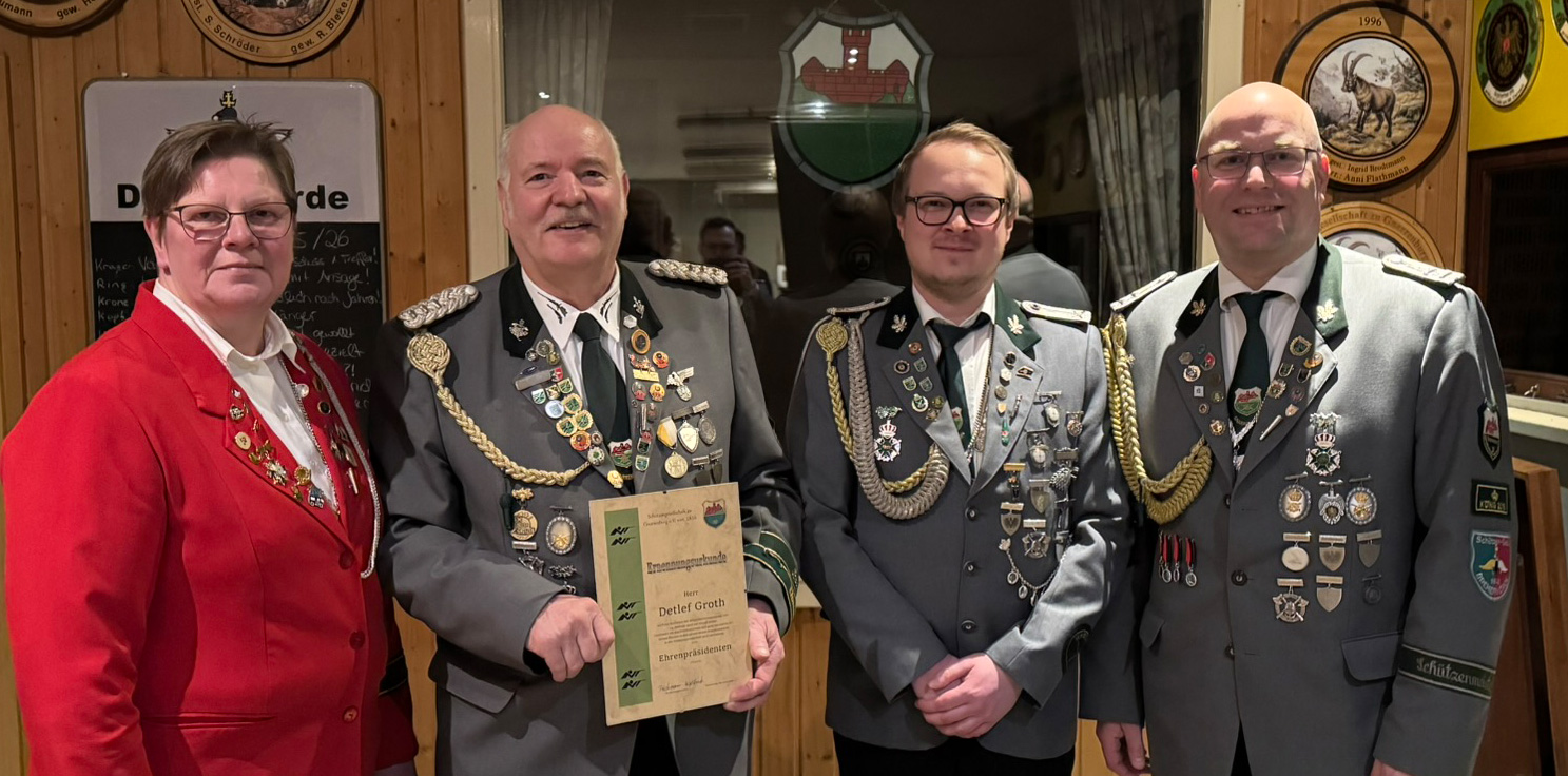 Am Samstag, den 14. Februar fand unsere Hauptversammlung statt. Präsident Detlef Groth begrüßte die Mitglieder und anwesenden Würdenträger im Schießstand. In seinem Bericht warf er einen Blick zurück auf die Höhepunkte des vergangenen Schützenjahres, insbesondere das Schützenfest mit dem Showact auf der Zeltfete kam bei Gästen und Schützen sehr gut an. Mehr Beteiligung wünschte er sich bei den Arbeitsdiensten sowie bei den übrigen Schießen des Vereins.